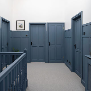 My Clients had recently moved into the home and requested 'WOW FACTOR'. We layered a bold blue with crisp white paint and added accents of orange, brass and yellow. The 3/4 paneling adds height to the spaces and perfectly guides the eye around the room. New herringbone carpet was chosen - short woven pile for durability due to pets - with a grey suede border finishing the runner on the stairs.